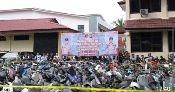 Kapolda Sumsel Sandi Nugroho memimpin langsung kegiatan penyerahan 497 unit kendaraan bermotor pada Rabu (8/4/2026) pukul 14.00 WIB di Lapangan Parkir Gedung Presisi Polda Sumsel, Palembang.