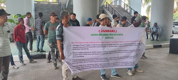Ampuhnews.com | Palembang – Puluhan massa Jaringan Masyarakat Sipil Anti Korupsi Indonesia (JAMSAKI) sambangi DPRD Kota Palembang untuk melaksanakan aksi damai terkait kebijakan mutasi jabatan yang terjadi dilingkungan jajaran Pemerintahan Kota Palembang, Sumatera Selatan, sorotan tajam tertuju pada penempatan seorang pejabat golongan Penata Tingkat 1 (3D) sebagai Sekretaris Dinas Pekerjaan Umum dan Penataan Ruang Kota Palembang.