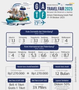 Ampuhnews.com Palembang – Meskapai penerbangan nasional Garuda Indonesia (GIA) gandeng Bank Mandiri sebagai fartner gelar Garuda Indonesia Travel Festival (GATF) di Kota Palembang yang berlangsung 17-19 Oktober 2025.